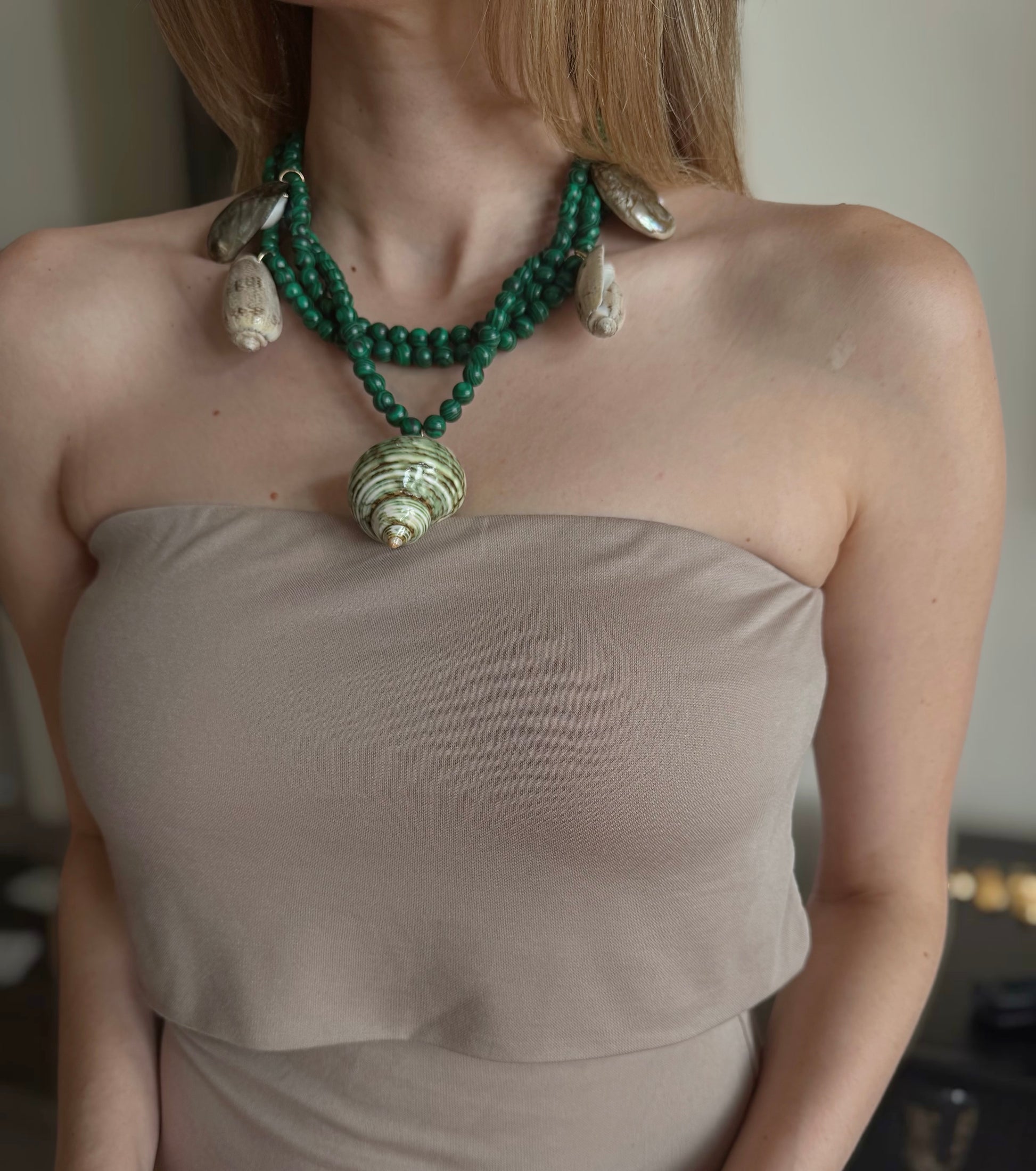 A dreamy mix of green malachite and soft shell beads, this piece brings grounding energy to your most elevated looks.