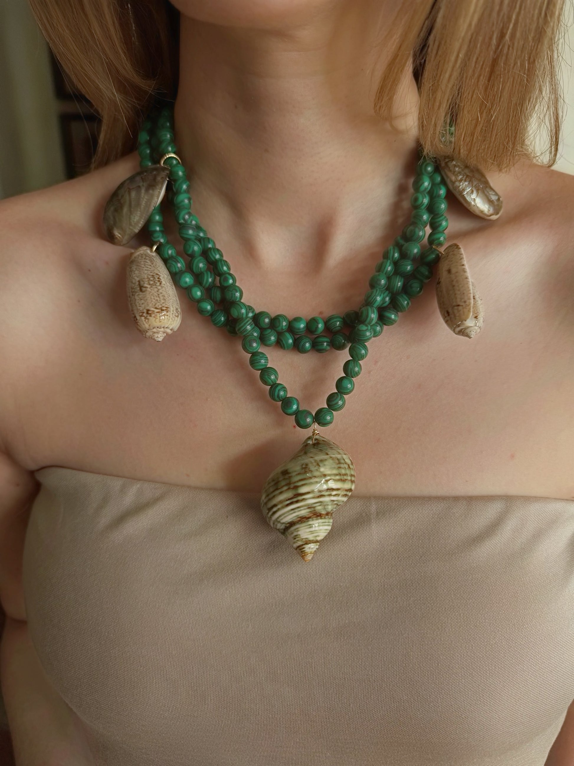 Inspired by deep tides and healing energy, this malachite and gold shell necklace channels earthy elegance. A natural stone with meaning, made for layering or wearing solo.