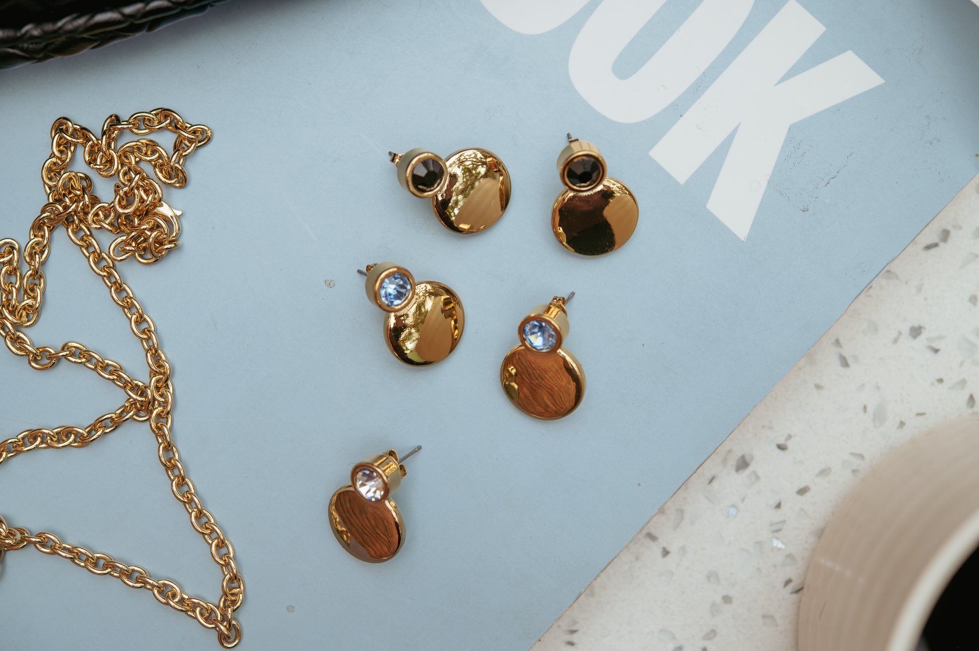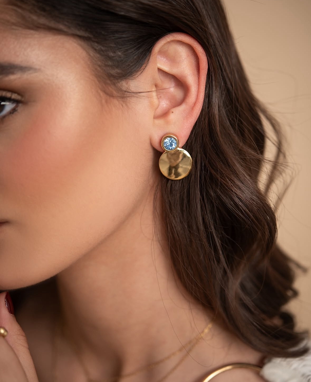 Soft color, bold style. The Nerea Baby Blue Earrings feature a sleek double-disc silhouette in polished 18K gold plating, accented with a delicate baby blue gemstone. Modern yet feminine, these earrings strike the perfect balance between statement and elegance. Lightweight and versatile, they’re ideal for brightening up your everyday fits or adding a pop of color to evening looks. Nerea Black Large Earrings